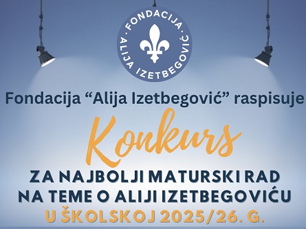Raspisan Konkurs za najbolje maturske radove na teme o Aliji Izetbegoviću u školskoj 2025/26. godini Na osnovu Odluke Upravnog odbora, Fondacija „Alija Izetbegović“ raspisuje konkurs za najbolje maturske radove na teme: „Vizija Bosne i Hercegovine u djelima i objavljenim govorima Alije Izetbegovića“ „Univerzalne ljudske vrijednosti u